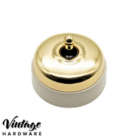 Toggle light switch with a brass based cover in Polished Brass finish with a white porcelain base.
